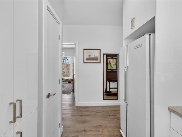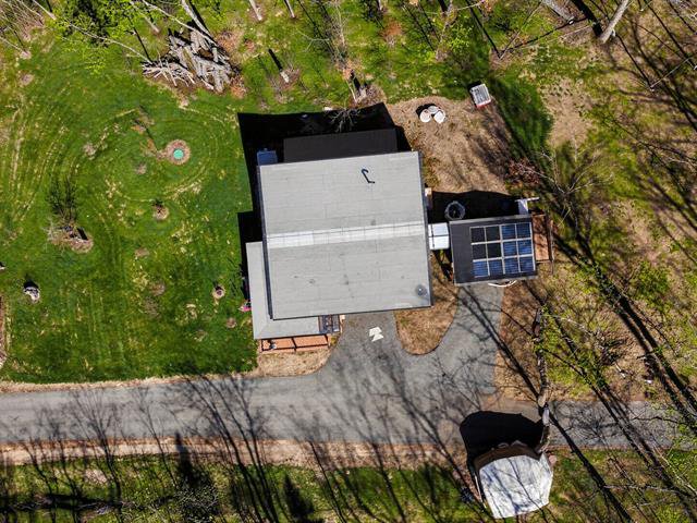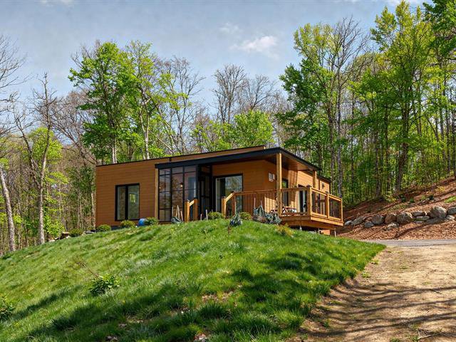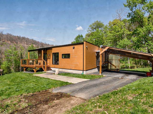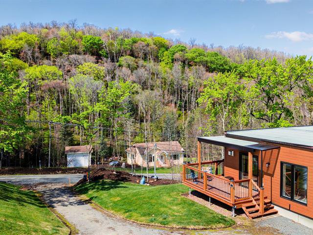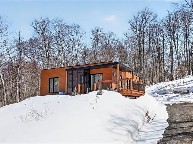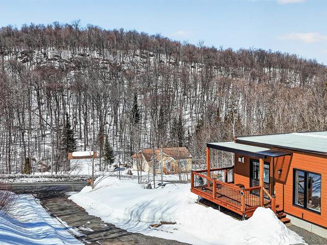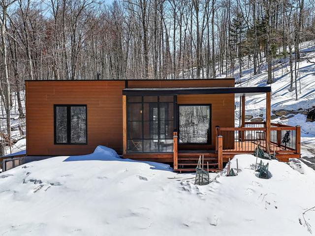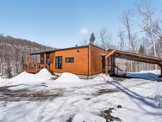 Enchanting setting. Very bright modern-style home with views of the mountain and forest. Large lot with carport, garden, and mature hard wood forest. Two bedrooms, one bathroom, and a vast open space in the basement with ceilings over 9 ft. Plumbing already in place in the basement for a second bathroom, two patio doors and space planned for a lovely family room and a third bedroom. Close to 3 beautiful beaches, regional park for hiking, cross country skiing and snowshoeing. Le Patriote theatre, and downtown centre on the lake Lac des Sables with park, restaurants, cafés and shopping.